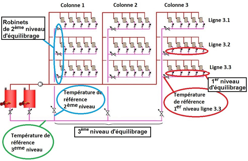Du fait des difficultés d’accès aux robinetteries, l’équilibrage concerne en règle générale le 2ème niveau d’équilibrage et les niveaux supérieurs. Dans le cas des circuits d’alimentation de planchers chauffants et des bâtiments du tertiaire, le 1er niveau peut également être traité.